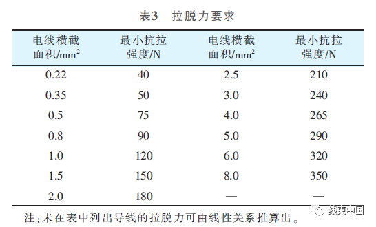 机械性能主要由拉脱力来衡量,要保证压接后的端子有较高的拉脱力。各个主机厂对拉脱力的要求不尽相同,如美国汽车工程学会USCAR-21中对拉脱力的要求见表3。