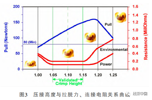 从上述介绍我们知道,端子压接的机械性能和电性能好坏的考核指标是拉脱力和电压降,那么怎么能够保证压接后的端子很容易通过机械性能和电性能测试呢?我们引入了剖面分析这个很重要的工具,同时,通过图3可以了解为什么具有符合规范剖面的端子很容易通过机械性能和电性能的测试。