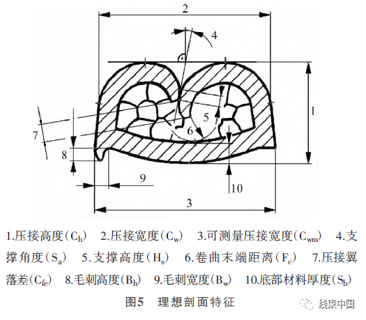 保证压接后的端子对插、穿护套等几何性能不出问题,包括喇叭口、料边、扭曲等几何外观。如图1所示,物理性能主要体现在压接的几何外观上。图1中每个序号的名称及作用如表1所述。