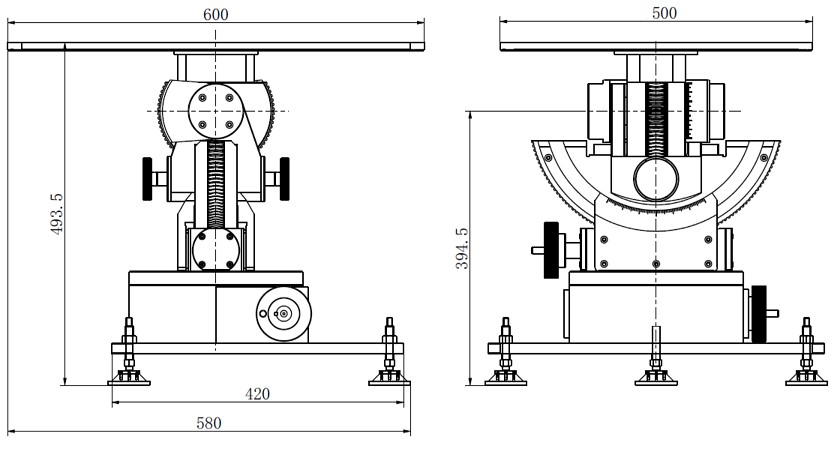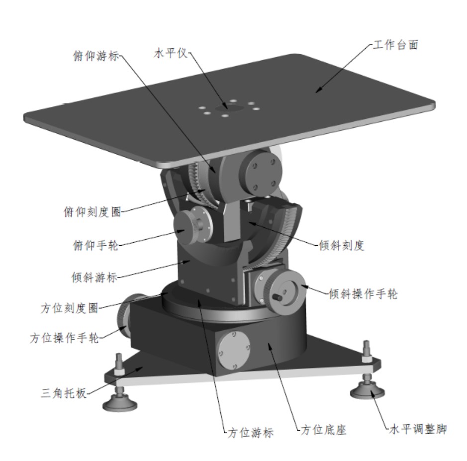 转台有三个调整水平地脚,调节方便快捷,调整范围0°~15°,工作台面上方在正交方向安装1个球型液泡。水泡或液泡误差不大于1′。