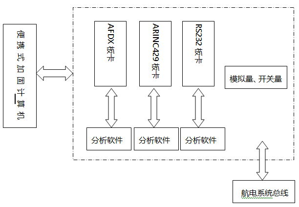 该系统硬件便携、可靠,配套通电调试用测试电缆应明确连线关系,产品软件使用方便、操作简易、功能完善,为操作者提供直观可视的信号数据。便携式总线检测仪主要实现综合航电系统AFDX、ARINC429、RS422、模拟量、开关量总线的控制数据和通信过程的监控。总线采集分析系统的主要组成包括测试加固计算机、AFDX模块、429模块、422模块、开关量、模拟量和应用软件组成。